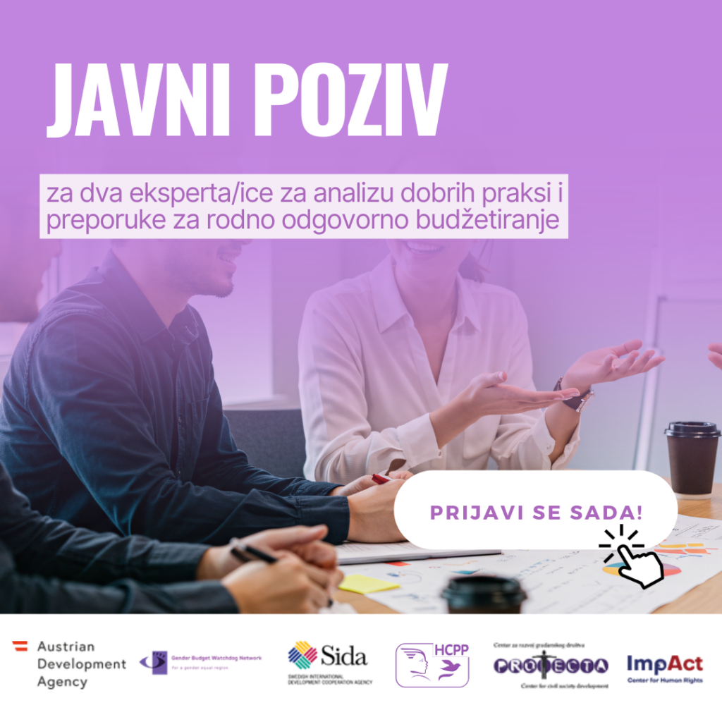 Prijave se dostavljaju najkasnije do 19.12.2025. godine na e-mail: info@chr-impact.com, sa naznačenim predmetom: Prijava za „ANALIZU DOBRIH PRAKSI I PREPORUKA ZA RODNO ODGOVORNO BUDŽETIRANJE“.